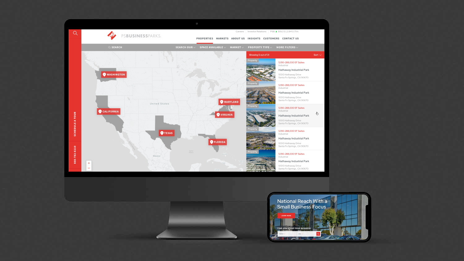 We were tasked to redesign their print materials and rebuild their website under a two months. The project’s central challenge was integrating the PSBP custom property management tool with our newly developed database to build. This helped to build a custom availability map for P.S. Business Parks clients.