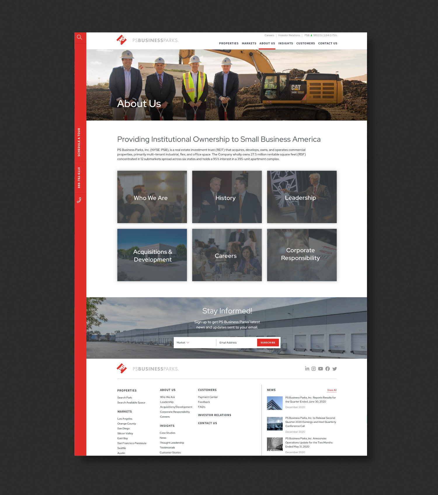 With the launch of the newly rebranded website, P.S. Business Parks stocks went up by twenty-three percent. We built a strong relationship with the client and worked on new print materials, and maintained constant maintenance and updates to their site.