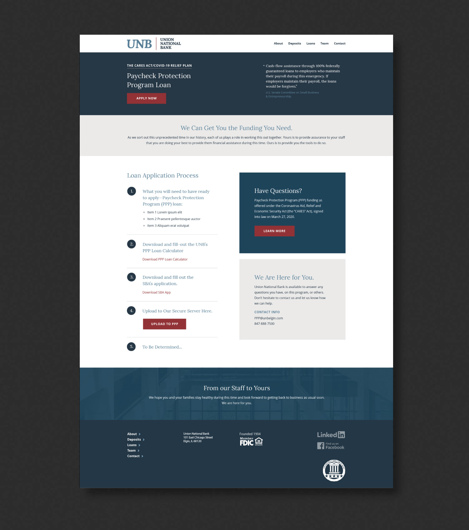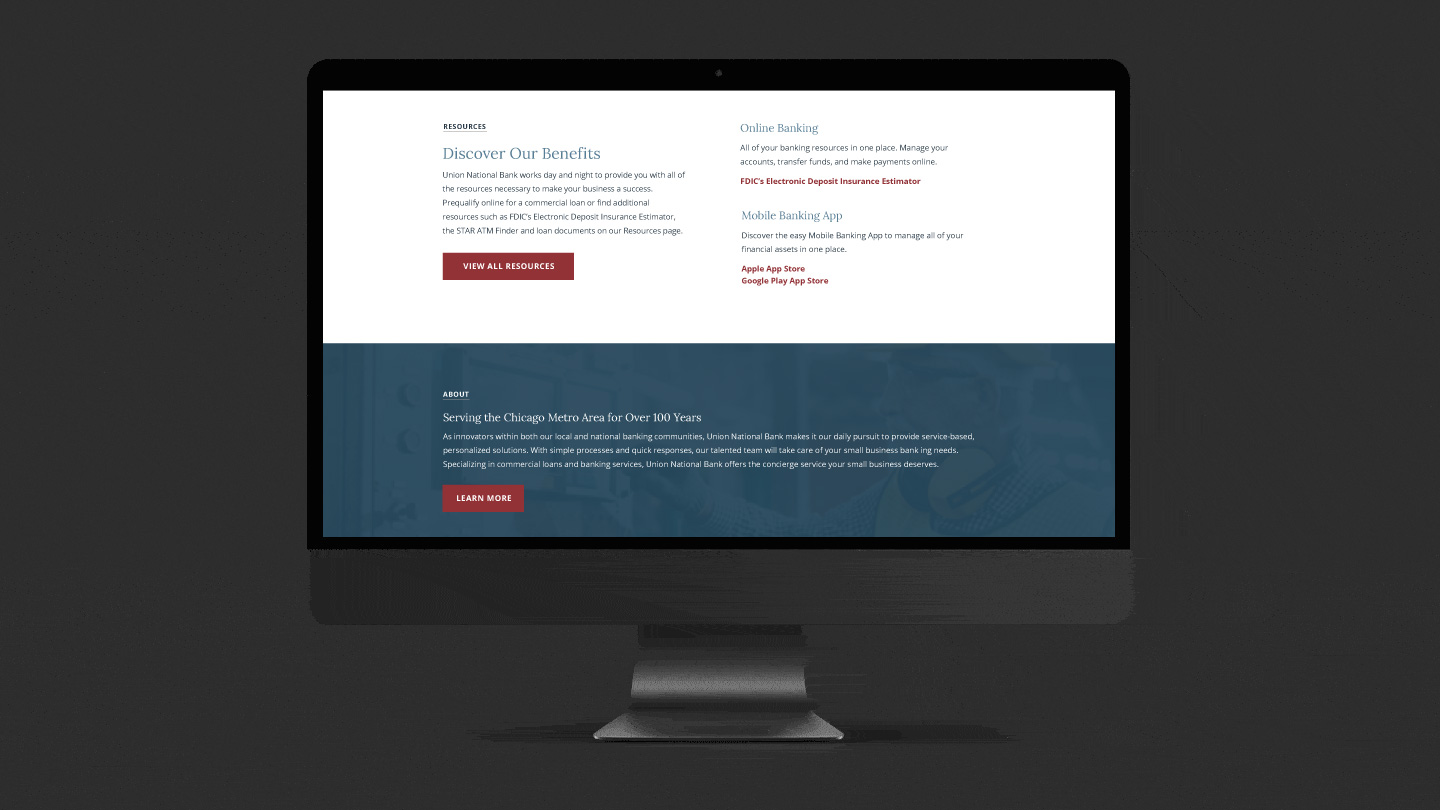 Helped Union National Bank of Elgin (UNB) execute a complete rebrand. The client is a family-owned bank that’s served Chicago for more than 100-years. We saw their potential to grow their business through their digital presence. We evaluated the current brand and needed an innovative visual identity system to align with their modern, updated digital brand adequately.