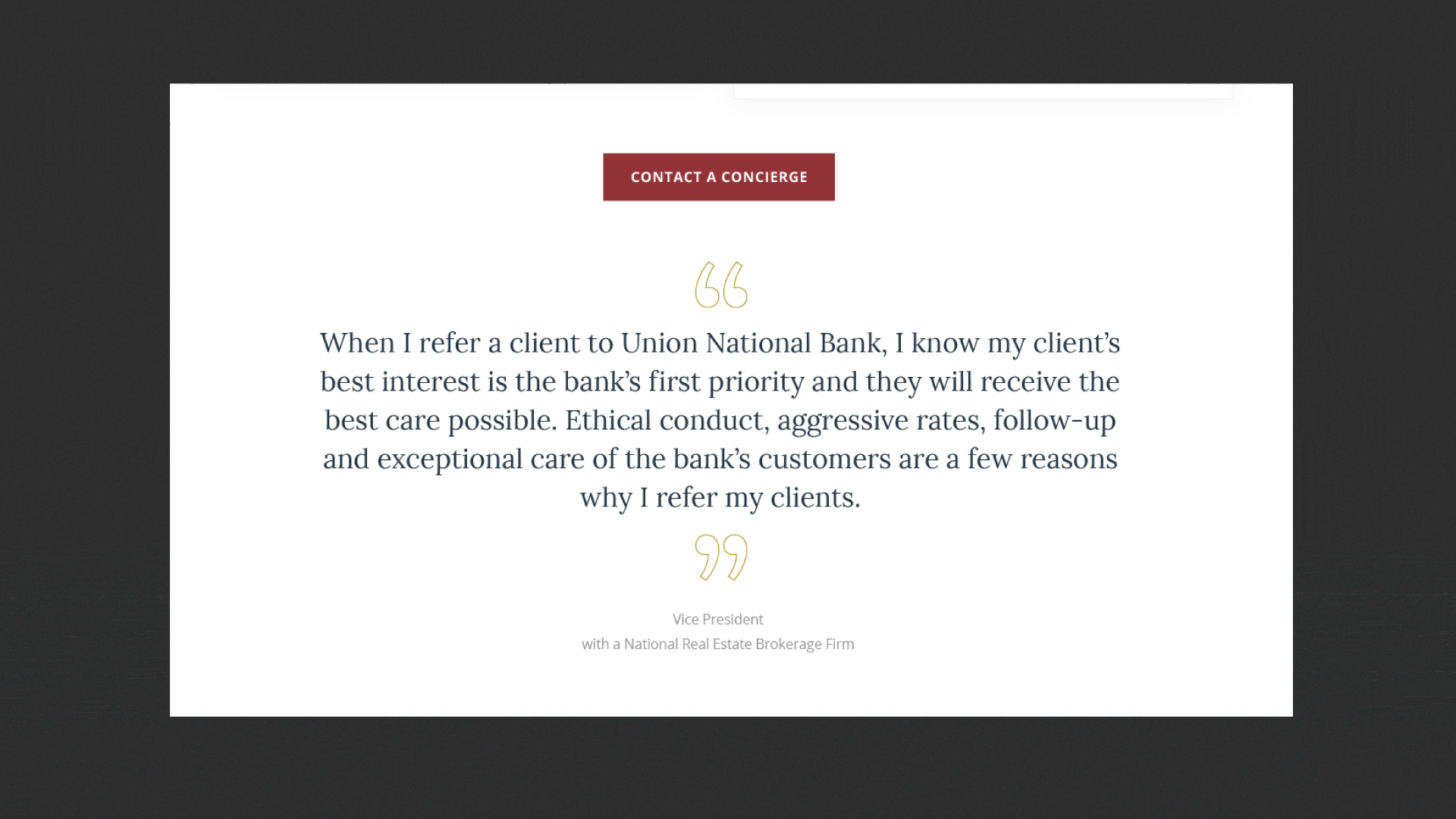 Union National Bank has been serving Elgin and the Chicago Metro Area for over 100 years since opening in 1904. As innovators within both local and national banking communities, Union National Bank provides service-based, personalized solutions. With simple processes and quick responses, their talented team will take care of all banking needs. Specializing in commercial loans and banking services, Union National Bank offers the concierge services all small businesses deserve.